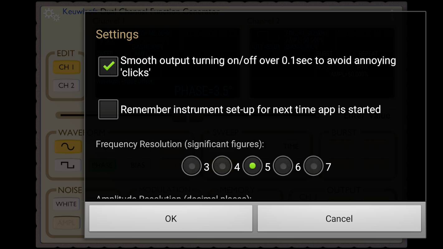 La sortie est de 16 bits pour chaque canal gauche et droit et à 44,1 kHz. La sortie dépendra du matériel de votre appareil. Certains matériels de l'appareil peuvent filtrer la polarisation CC et les signaux basse fréquence. Aux hautes fréquences, les formes d'onde seront déformées en raison du nombre limité d'échantillons pour chaque forme d'onde (par exemple à 4,41 kHz, une forme d'onde sinusoïdale sera approximée par seulement 10 points). Il s'agit donc d'une utilisation ludique/éducative, pour les applications critiques, utilisez un véritable générateur de fonctions calibré.