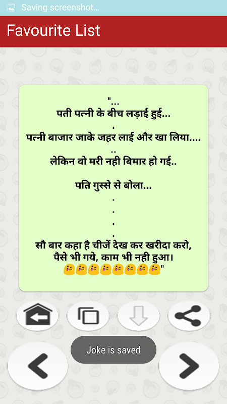 The collection of top most funny & entertainment Hindi Jokes that you can Enjoy sharing with your friends and family members over social networking sites like Facebook twitter whatsapp etc. You can download share or send any joke by just a single tap on social media websites such as Facebook Instagram twitter Linkedin Google etc as well as on chat messengers such as WhatsApp Snapchat Hike etc. You can also save Jokes as text or as Picture in JPG or PNG Format to your mobile phone internal storage memory or in your cell Phone SD Card and can share later as photo.