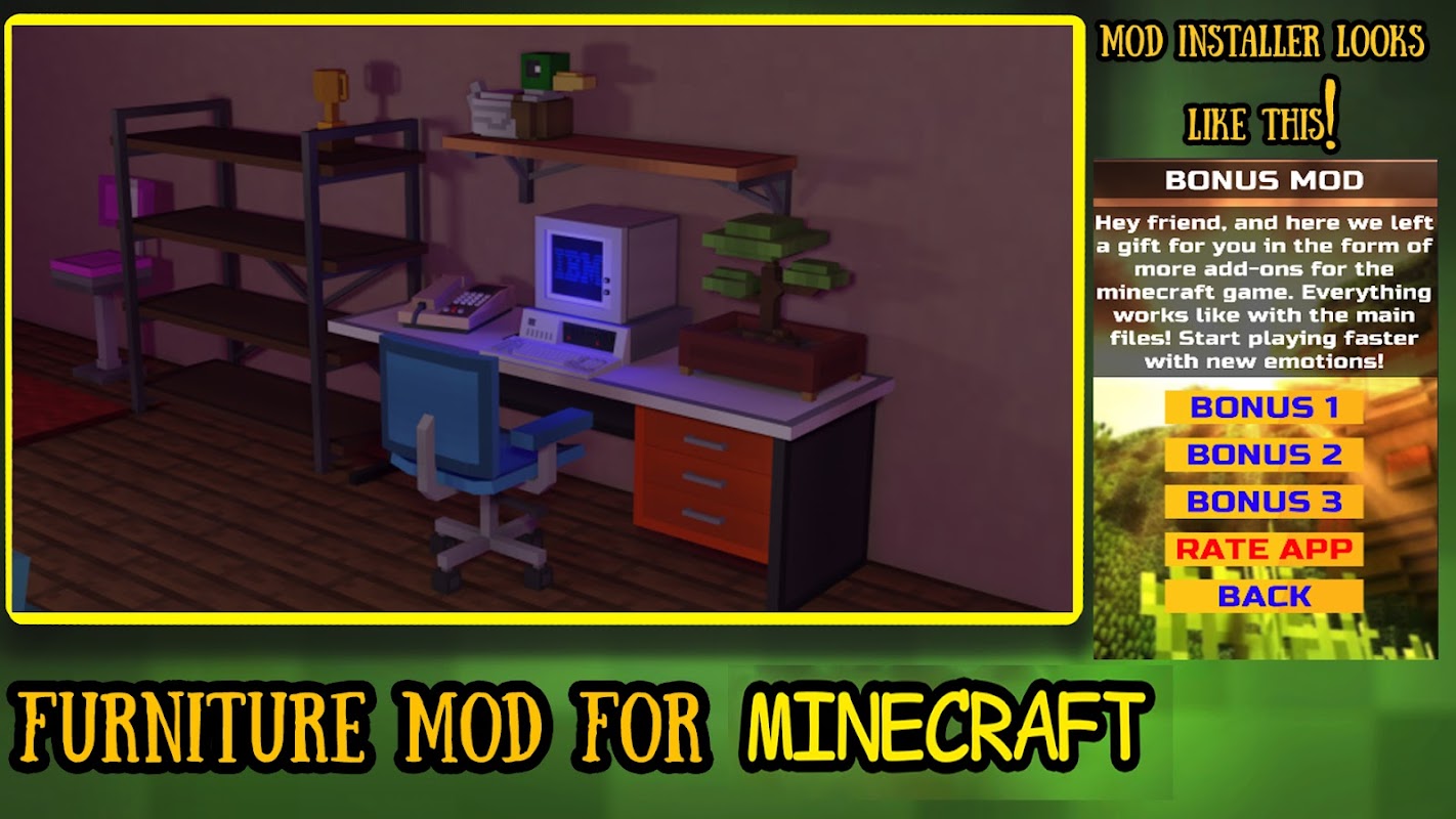Notre application utilise le mot "Minecraft" comme nom alternatif afin que les fans du jeu puissent trouver des mods pour cela. L'icône et les captures d'écran ont été créées par notre équipe de développement et ne sont pas un atout en jeu de Mojang.‼