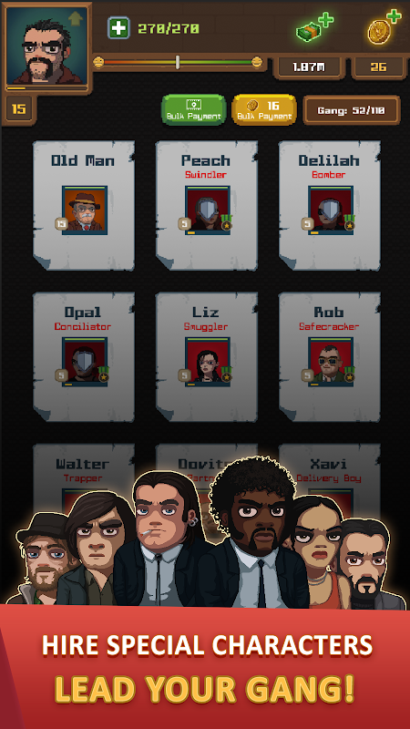 🔥 Montez au pouvoir : Plongez dans une guerre de gangsters trépidante et posez les fondations de votre entreprise criminelle dans ce RPG de gangs. Choisissez une équipe de gangsters endurcis, chacun doté de compétences et d'aptitudes uniques. Entraînez-les, transformez-les en une force redoutable, envoyez-les en mission et regardez votre influence se propager comme une traînée de poudre.