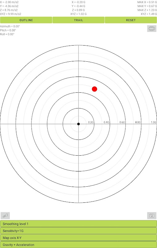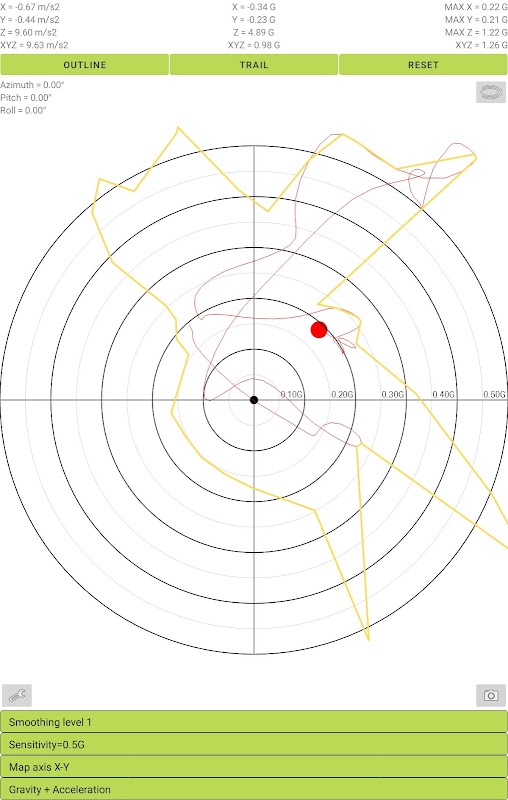 Découvrez la puissance de l'accéléromètre de votre appareil avec G-Meter, l'outil ultime pour mesurer et visualiser l'accélération ! Découvrez un monde fascinant de la physique en observant le mouvement d'une boule rouge sur une carte polaire, représentant des données d'accélération en temps réel.