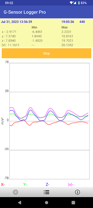 Appuyez sur "Logging" pour commencer à enregistrer les données de l'accéléromètre. Pour arrêter l'enregistrement, appuyez à nouveau sur le bouton