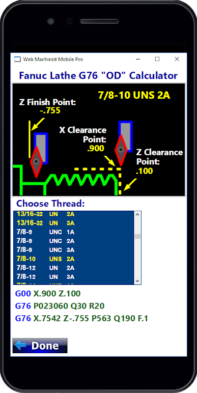 Program Fanuc CNC Lathe G76 Threading Cycles Quickly and Easily with these Calculators! Simply choose the thread specification from the OD or ID threads lists and input a few desired parameters such as Thread Start Point, Thread Finish Point, Number of Spring Passes, Finishing Allowance, Deth of first Cut etc. and the G76 Threading Calculators will program the Fanuc CNC Lathe G-Code needed to perform the threading cycle. Easy as that! Web Machinist Mobile Pro® has many calculators for CNC Machinists, Programmers and QC Inspectors. Including Calculators for Angles, CNC Applications, CNC Lathe Fanuc Canned Cycles including G76 Thread Cycle Calculators, Simple Lathe Cam CNC Lathe Tool Nose Compensation G-Code Calculators, Chamfer G-Code Calculators, Metric Conversions, Countersink Depth Calculators, Center Drill Depth Calculators, General Conversions, CNC Drilling, CNC Mill & Lathe Deep Hole Drilling calculators, Dovetail Measuring Calculators, Blueprint Symbols, G Codes, M Codes, Machining Formulas and calculators, Spindle speed and feed rate formulas and calculators, circle solving formulas, Hole Patterns, Hole Array Patters including full circle and partial circle patterns, 3 Wire Threads Pitch Diameter Measuring Calculators for Unified Threads, Metric Threads, Acme Threads and Metric Trapezoidal Threads, CNC Lathe Tool Nose Radius compensation calculators, QC Inspection, Manual Machining, Metal Removal Rates, CNC Milling, Reference, Rotary Axis, Speeds & Feeds, Imperial and Module Spur Gear Dimensions Calculators, CNC Tapping, CNC Threading, Manual Lathe Calculators, Unified Threads, Metric Threads, Acme Threads, Metric Trapezoidal Threads, Spur Gears, Module Spur Gears, Imperial Spur Gears, Area Calculators, Triangles, Circle Calculators, Mill Machine Tooling, Collets dimensions, Keyseat Cutters Calculators, Trigonometry Calculators, Hole Pattern Calculators, Wheel Bolt Pattern Calculators, Manual Mill Calculators, Tooling & Hardware, Sine Bar and Compound Sine Plate calculators, Trigonometry & Geometry, Shop Math Calculators, Lathe Spindle Speed Calculators, CNC Tapping Speeds Calculators, Surface Roughness Calculators, Drilling Speeds Calculators, Tapping Speeds Calculators, CNC Turning and Miscellaneous Calculators. This is a Must Have APP for Machinists, CNC Machinists, Machine Shops, QC Inspectors, CNC Set-up Operators, CNC Programmers.