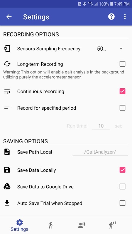 * Les données de démarche calculées peuvent être calculées sur une durée donnée (par exemple, des essais de 10 secondes), en continu jusqu'à l'arrêt, et même être exécutées toute la journée en arrière-plan de votre téléphone (en version bêta maintenant)!