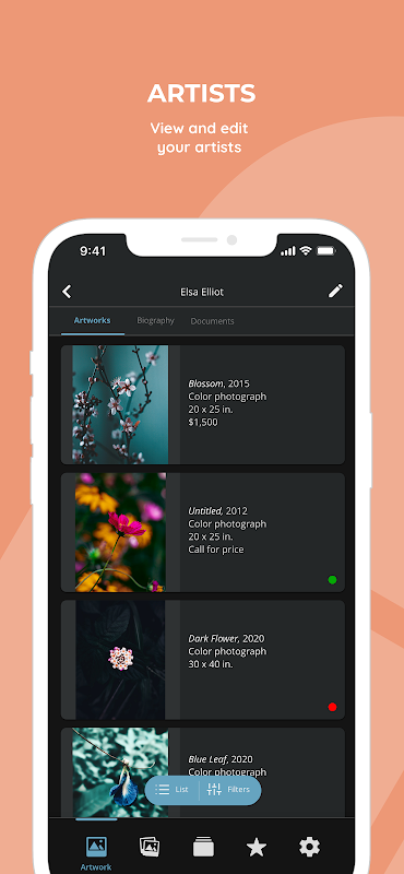 Affichez et créez des collections pour des présentations commerciales avec des collectionneurs ou ajoutez de nouvelles œuvres d'art à votre base de données directement depuis votre téléphone ou votre tablette. Imprimez des feuilles détachables, diffusez des diaporamas et envoyez des propositions personnalisées par e-mail aux clients.