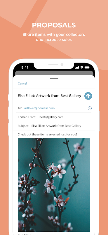 -Envoyer par e-mail une sélection d'œuvres d'art à un client via l'application et inclure des documents supplémentaires, tels que la biographie de l'artiste et le curriculum vitae.