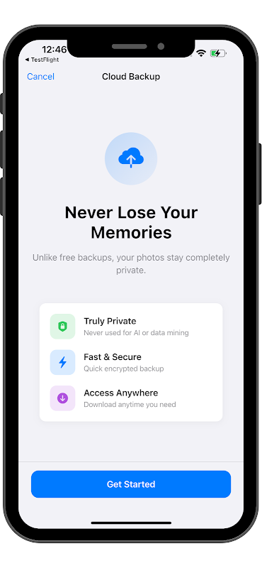 Ne craignez plus de perdre vos précieux souvenirs. Sauvegardez vos photos sur notre espace cloud privé et chiffré avant de les supprimer. Restaurez-les à tout moment d'un simple toucher. Vos photos sont protégées par un chiffrement de bout en bout AES-256.