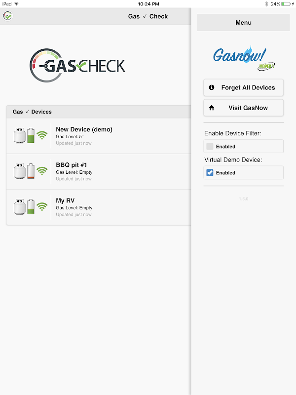 Cette application est conçue pour être utilisée avec le capteur GasNow GASCHECK. L'application GASCHECK peut mesurer le niveau de propane de GPL pour vous dire le niveau de remplissage exact et quand votre bouteille est vide. Il peut être utilisé sur les bouteilles trouvées dans les véhicules récréatifs, les radiateurs, grilles de barbecue, etc. Les gaz Vérifier les capteurs sont magnétiquement coincé au fond de votre bouteille de propane et périodiquement mesurer et envoyer sans fil le niveau de remplissage ou le pourcentage du gaz Vérifier app. Collez sur le fond de la bouteille et de savoir exactement quand vous êtes à court de propane! Cette technologie est en attente de brevet.