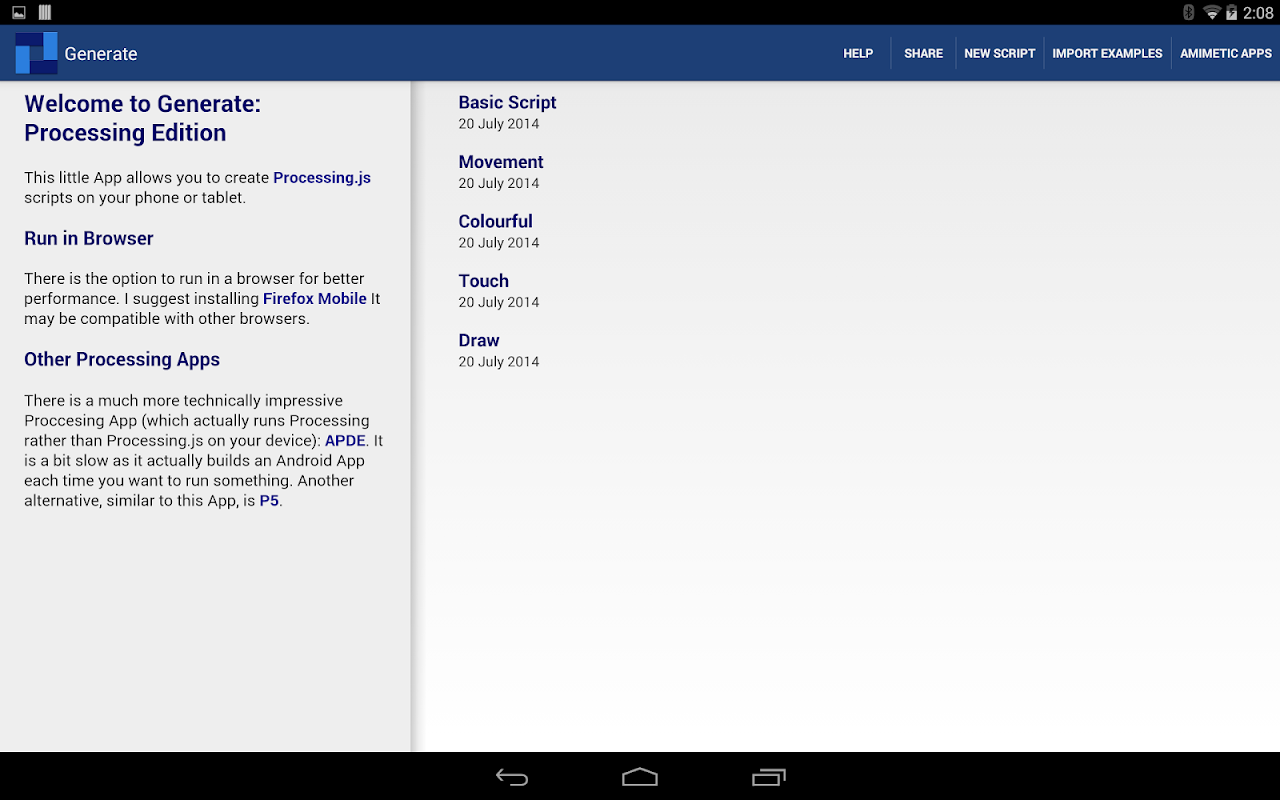 Write and run Processing(.js) scripts on your phone or tablet. With syntax highlighting, examples and inline help.