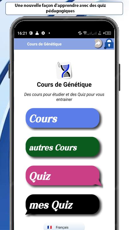 Cette application gratuite est une Bibliothèque dynamique alimentée par les meilleurs sites éducatifs français spécialisés dans des cours de Génétique.