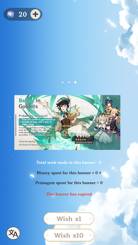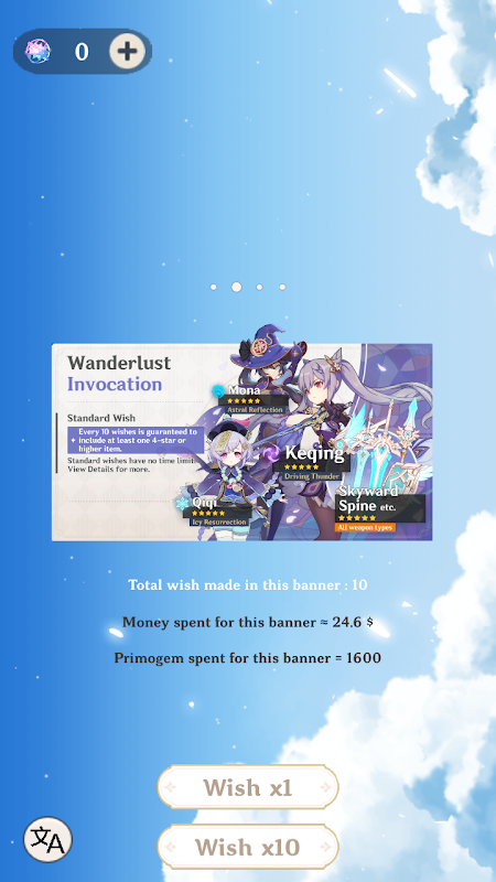 Un simulateur de souhaits non officiel fait par des fans pour Genshin Impact. Vous pouvez choisir des bannières pour les souhaits et vous pouvez voir combien d'argent et de primogem sont nécessaires pour ces souhaits.