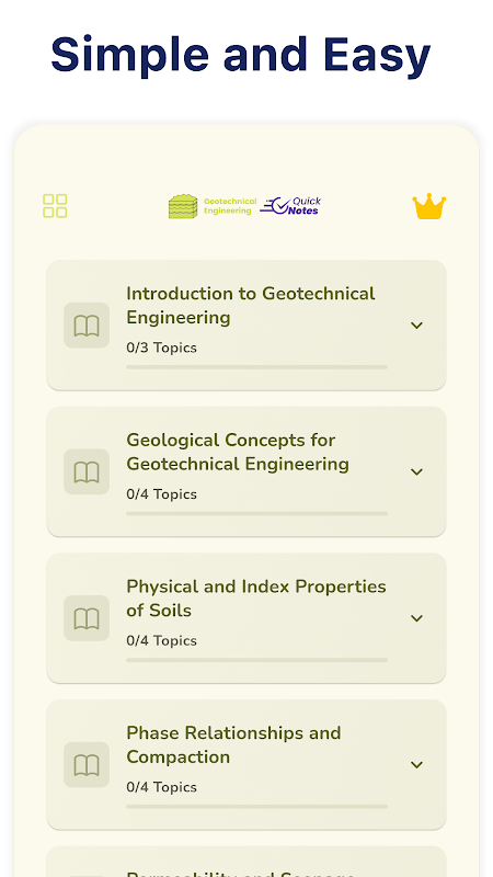 Développez une solide compréhension de l'ingénierie géotechnique avec cette application d'apprentissage complète conçue pour les étudiants, les ingénieurs et les professionnels de la construction. Que vous étudiiez les propriétés du sol, la stabilité des pentes ou la conception des fondations, cette application propose des explications claires, des informations pratiques et des exercices interactifs pour améliorer votre compréhension des matériaux terrestres et de la stabilité structurelle.