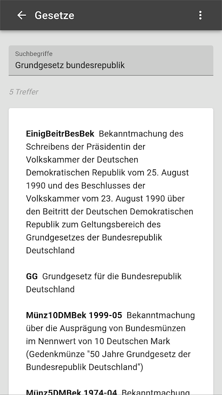 Les lois viennent du site Internet du ministère fédéral de la Justice (BMJ) www.gesetze en internet.de et récupérées et affichées par l'application.