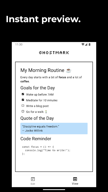 GhostMark est un éditeur Markdown léger et sans distraction, conçu pour les appareils mobiles. Que vous preniez des notes rapides ou rédigiez des articles de blog complets, GhostMark vous offre un environnement propre et ciblé pour écrire à tout moment et en tout lieu.
