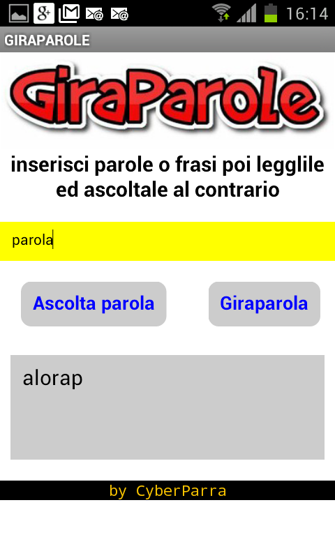 GIRAPAROLE è un giochino semplice e divertente che ti scrive e ti legge le parole che inserisci al contrario.