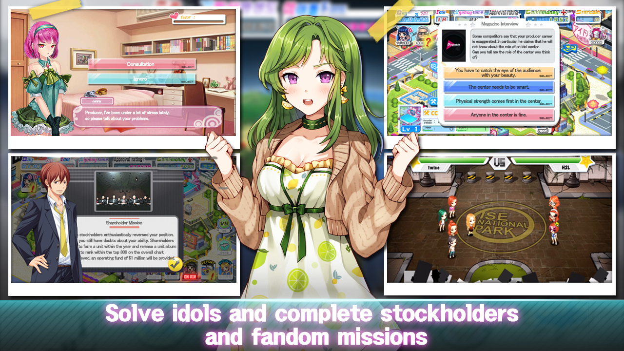 N'oubliez pas qu’en fonction de votre philosophie et de vos compétences en matière de gestion, les idoles appartenant à votre agence peuvent devenir des idoles de classe mondiale ou disparaître de la mémoire publique en même temps que leurs débuts.