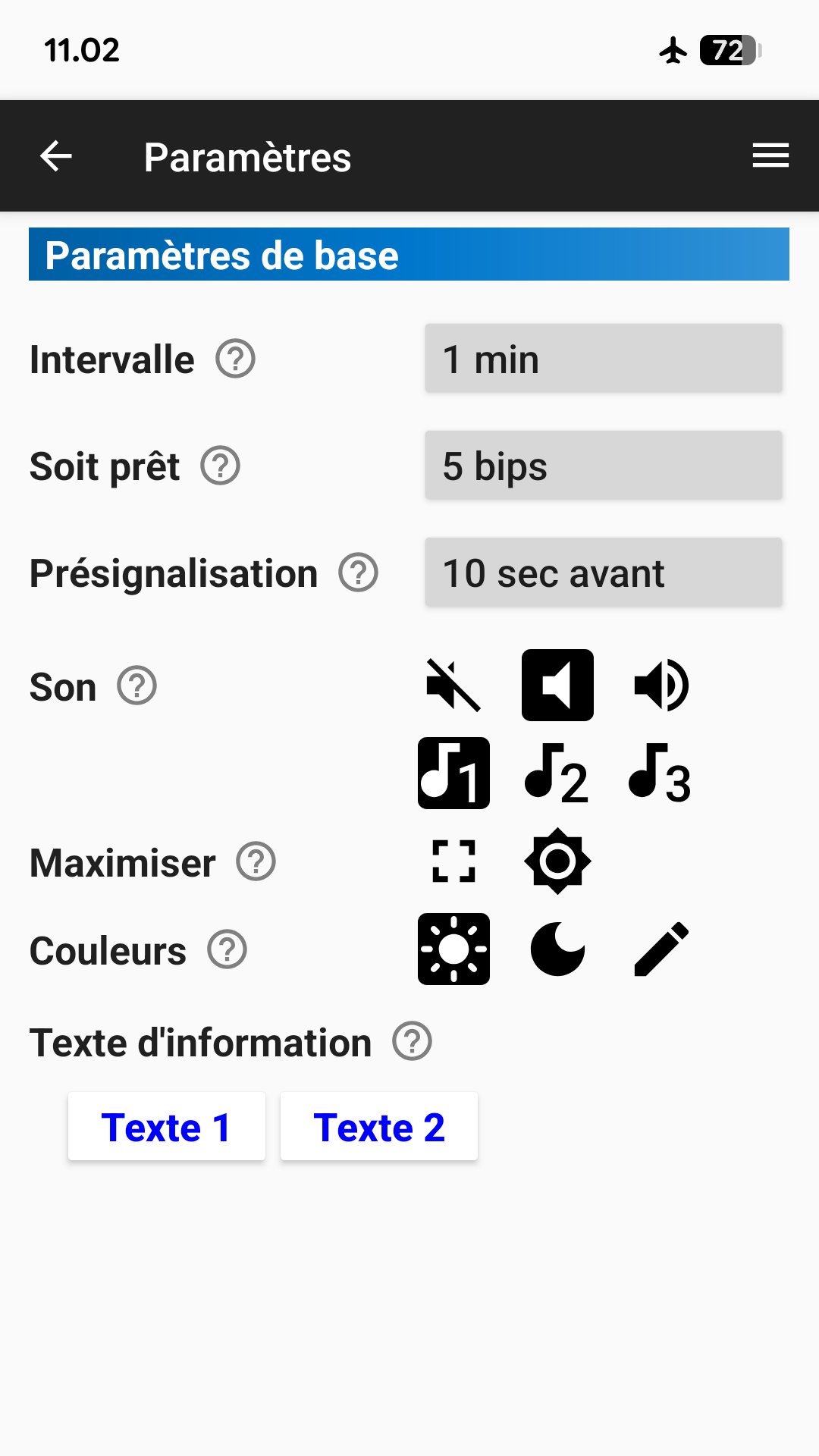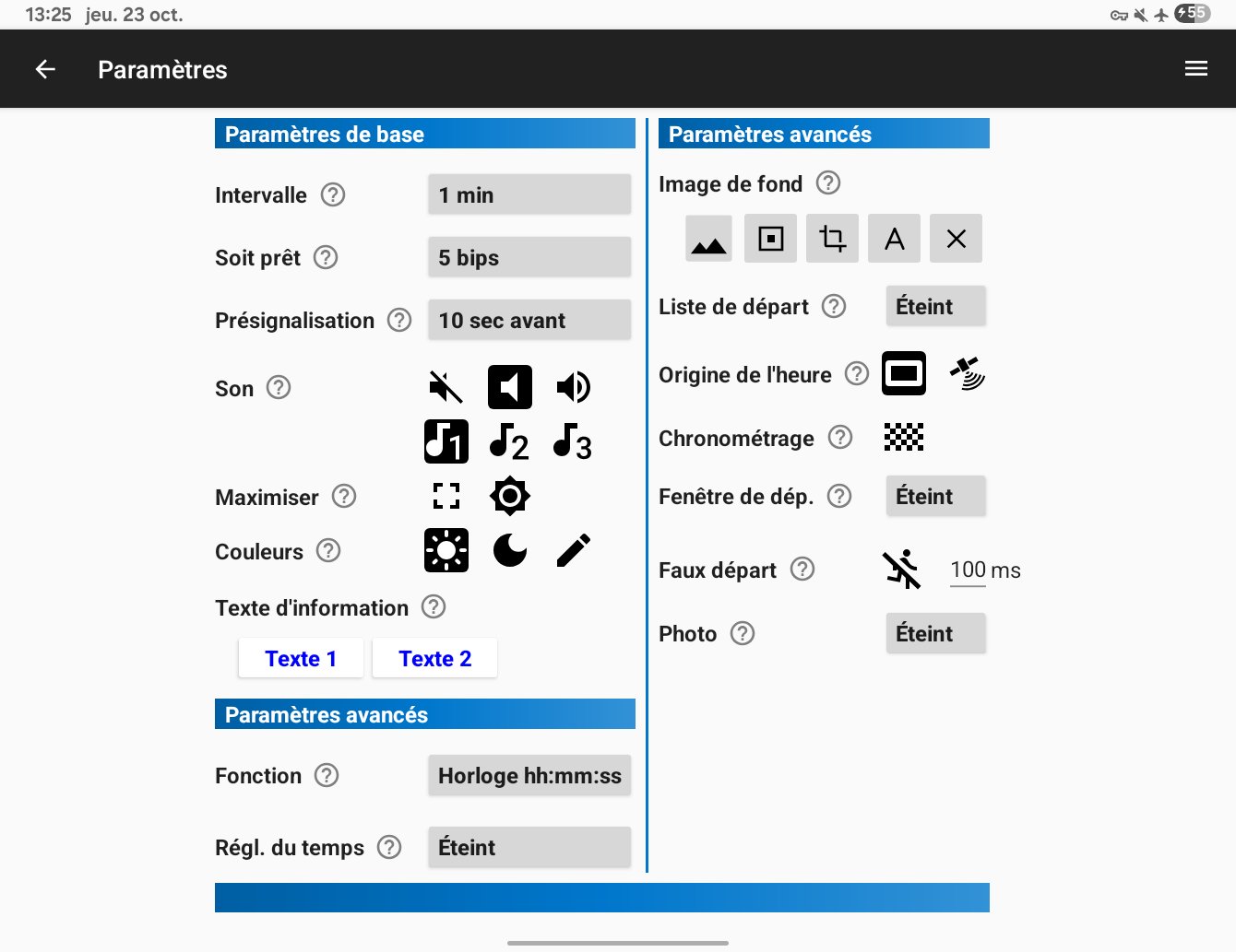 - Se préparer (bips sur les secondes avant le départ, 55-56-57-58-59 sec).