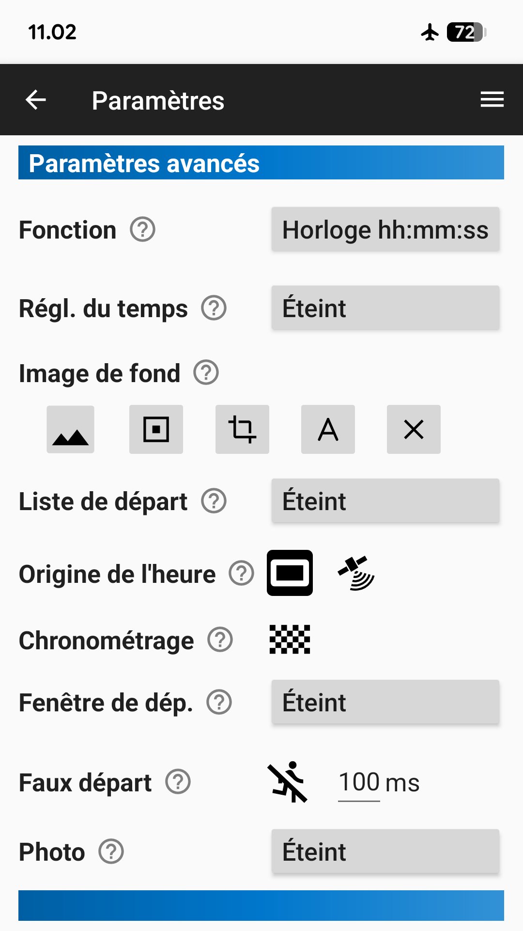 - Couleurs sélectionnables par l'utilisateur pour le temps normal, les secondes avant le départ, et la seconde de départ (peut ressembler à un feu de circulation).