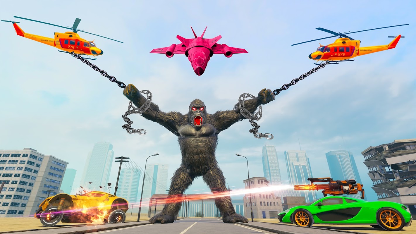 King kong games: Angry Gorilla City Rampage brings adventure journey in the monster gorilla games of city rescue and animal games where the dino games & super rage gorilla are playing in the style of rampage game. The gorilla glider in the rampage city is to eliminate the animals by unlocking all dangerous & wild dinosaurs to become powerful to fight by dinosaurs and gorillas. Unlike all other dinosaur attack vs Godzilla games you just need to save yourself & attack all the city cars in the angry gorilla city rampage game& so prove yourself in the free gorilla fight games. Play these monster gorilla games in this epic Jurrasic world as a dino and gorilla in dinosaur and gorilla glider to help out city rescue in the animal fighting games of city rescue and dino rampage games. Perform in all the city rampage game and in dinosaur evolution game where dinosaur and gorilla strike is on its peak and kill the monster rampage city with the help of chimpanzee running of animal attack games in the Jurassic world. Special task forces will attack you with bullets and launchers, dodge and counter their attacks by destroying them on the spot of the dinosaur fighting game. Mega dinosaur attack and gorilla rampage came from Jurrasic world games and trying to overtake the big world of gorilla rampage attack: angry gorilla games by their big foot in dinosaur attack and dinosaur games.