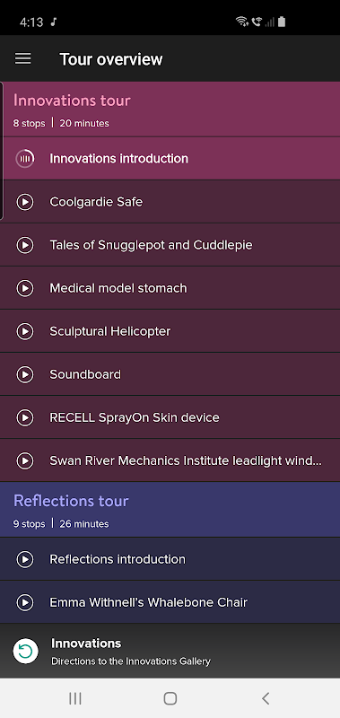 Gogo, nommé d'après l'emblème des fossiles de l'État d'Australie-Occidentale, utilise la reconnaissance de l'emplacement Bluetooth pour vous guider à travers les galeries lors d'une visite linéaire, en affichant du contenu supplémentaire sur des objets Hero importants avec des éléments audio narratifs conçus, ou vous permettant de graviter vers ce qui vous intéresse le plus, vous montrant quels objets vous pouvez approfondir dans votre emplacement actuel.
