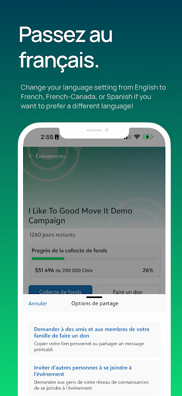 • Partagez votre page de collecte de fonds pour gagner des supporters et des dons en utilisant vos outils de communication préférés sur votre téléphone (c.-à-d. SMS, iMessage, e-mail, plateformes de médias sociaux)
