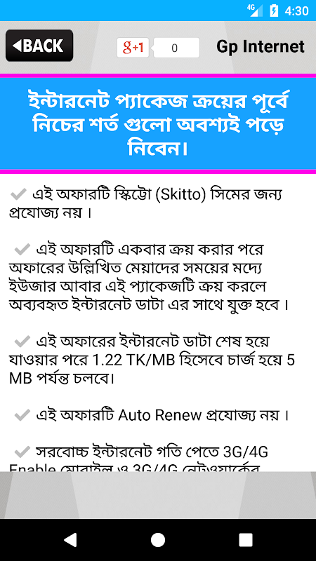 এই App টি থেকে আপনি গ্রামীণফোনের সকল ইন্টারনেট প্যাকেজ, জিপি ইন্টারনেট অফার, জিপি সোস্যাল প্যাকেজ সম্পর্কে জানতে পারবেন। সকল প্যাকেজ সমূহ সুন্দর ভাবে উপস্থাপন করা আছে, আর প্রত্যেকটা প্যাকেজের শর্তাবলীও সুন্দর ভাবে দেওয়া আছে।