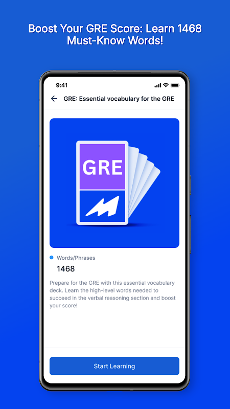 Vous préparez le GRE ? Cette mini-application vous aide à maîtriser les mots essentiels souvent testés lors de l'examen, garantissant une préparation optimale pour la section verbale. Grâce au SRS (Système de Répétition Espacée), nos cartes se concentrent sur la rétention à long terme, vous permettant d’étudier de manière plus intelligente et efficace. Avec des cartes soigneusement conçues, cette application est parfaite pour ceux qui visent un score élevé à la section verbale du GRE.