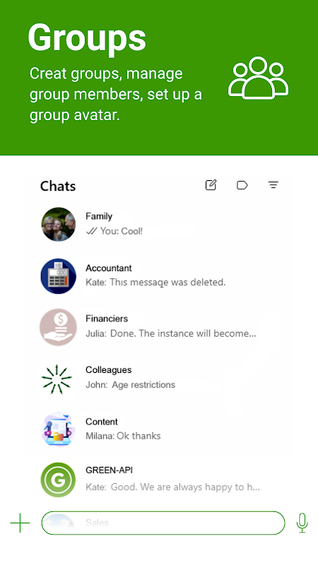 L'application vous permet de gérer votre compte et les paramètres de vos instances de service GREEN-API.