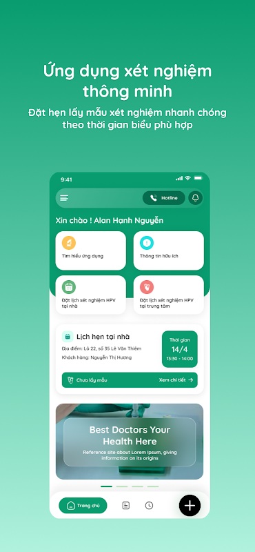 GreenLab est une application médicale intelligente de Green Lab Test Center System avec une plate-forme technologique moderne, des fonctionnalités constamment mises à jour et optimisées. L'application apporte des expériences pratiques aux clients avec des fonctionnalités exceptionnelles : prise de rendez-vous en ligne, gestion des rendez-vous, suivi détaillé du parcours de l'échantillon, réception et gestion des résultats des tests, gestion des enregistrements des enregistrements de test pour toute la famille, recherche d'informations relatives aux indicateurs de test.