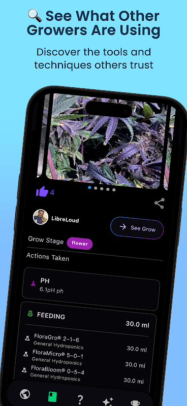 Rejoignez une communauté florissante de producteurs de cannabis où vous pourrez partager des conseils de culture, poser des questions et obtenir des conseils d'experts en temps réel. Grow Guide est le journal de culture et le suivi des plantes ultime, conçu pour vous aider à enregistrer chaque étape de votre culture sans effort. Avec des réponses basées sur l'IA, un suivi intuitif et un réseau de producteurs solidaires, notre application de suivi du cannabis rend la culture plus facile et plus réussie, que vous soyez un cultivateur débutant ou expérimenté.