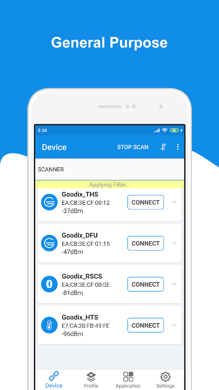 GRToolbox est une application mobile qui peut analyser les appareils Bluetooth LE, démontrer les applications de profil standard et déboguer conjointement les fonctions de profil/service liées aux plates-formes Goodix Bluetooth LE, pour aider les utilisateurs à démarrer rapidement avec le développement secondaire et les applications de débogage basées sur les SoC Goodix Bluetooth LE.