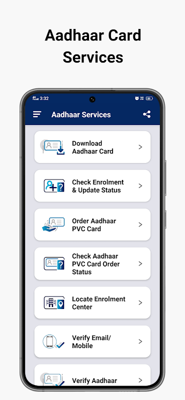 • Tableau de bord du service principal : accès direct pour télécharger Aadhaar, commander une réimpression, mettre à jour l'adresse, afficher ou scanner le code QR, vérifier Aadhaar, vérifier le courrier/e-mail, récupérer l'UID/EID, demander une lettre de validation d'adresse.