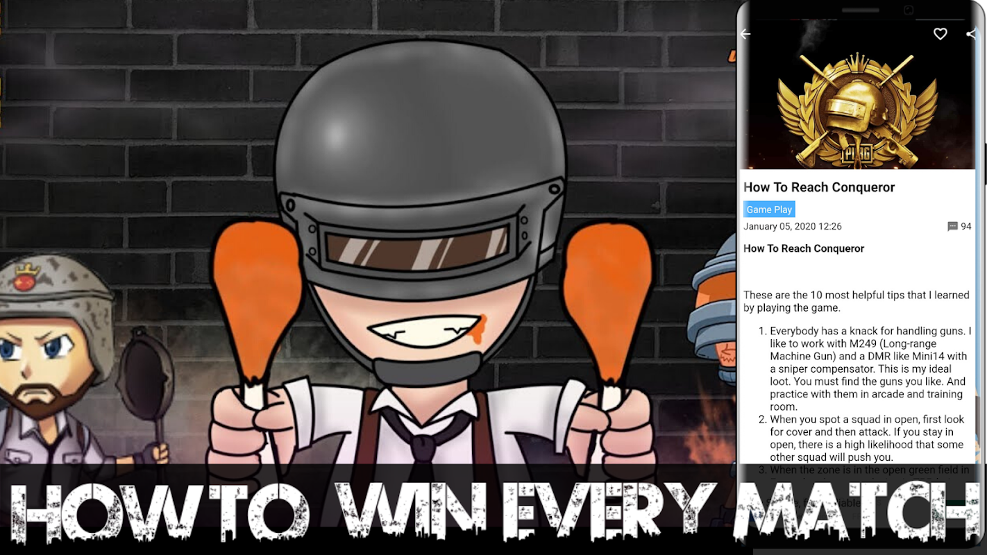 This Is a Pubg Guide about PUBG Maps, Weapons, Items, Community, News, Tips and Tricks which will help you get Chicken Dinner. If you are new to PUBG, this PUBG GUIDE will help get in the top 5 or even a chicken dinner. With all the information provided in this guide, check out which guns suit for you to seal the victory! Tips App Guide for PUBG Released! Guide for PUBG provides all about PlayerUnknown's BattleGrounds.Winner Winner Chicken Dinner !!