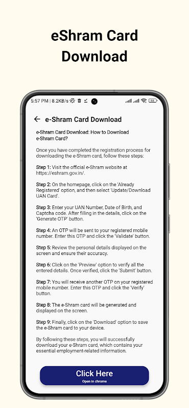 Une fois que vous avez terminé le processus d'inscription pour télécharger la carte eShram, suivez ces étapes :