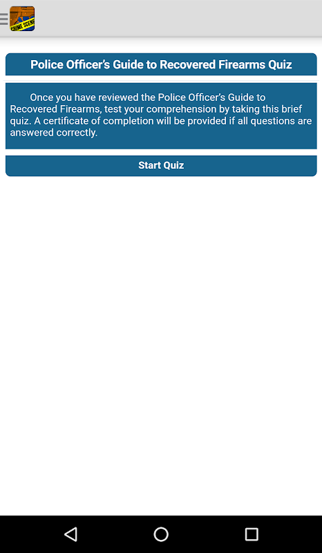 Once you have reviewed the Officer’s Guide to Recovered Firearms, test your comprehension by taking the quiz. Respond correctly to every question and receive a certificate of completion by email to print and add to your file.