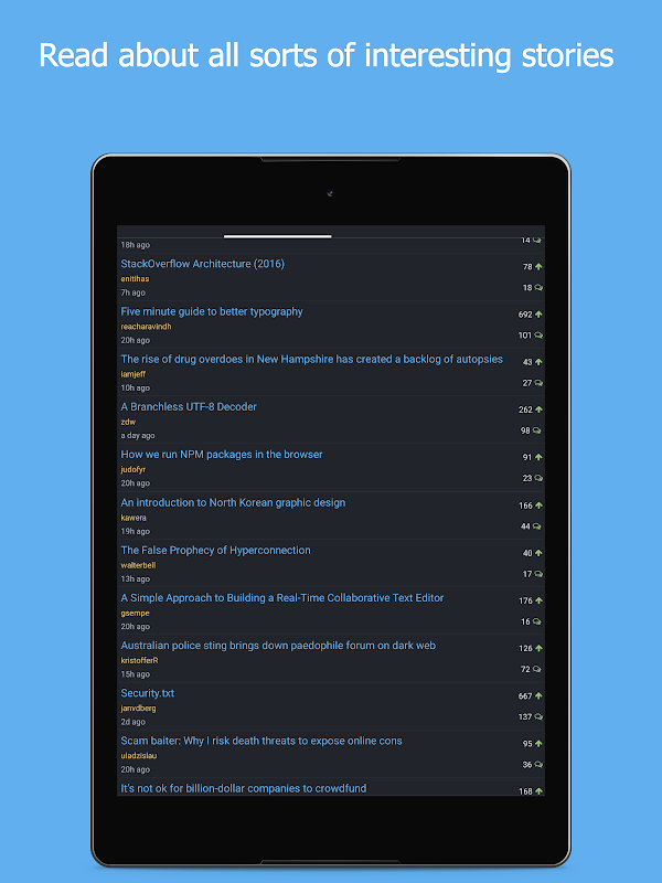 Read your favorite Hacker News (https://news.ycombinator.com/) stories in this dark themed app.