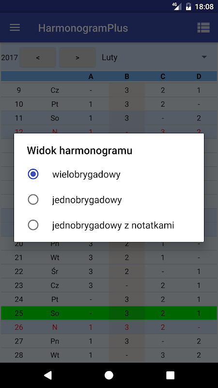 Dans les paramètres du programme, définissez le type de système de travail et les jours de début du cycle pour les brigades individuelles (le premier jour du premier quart pour les brigades A, B, C, D et E (pour une brigade de cinq brigades)). Sur la base de ces données, le programme calcule le calendrier de travail.