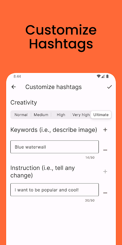 Tailor your hashtags to perfection! With Hashtag Generator, you have the freedom to customize your hashtags based on your unique preferences. Choose from up to 5 creativity levels, insert your own keywords, and even add personalized instructions. Make your content stand out with hashtags that reflect your individual style.
