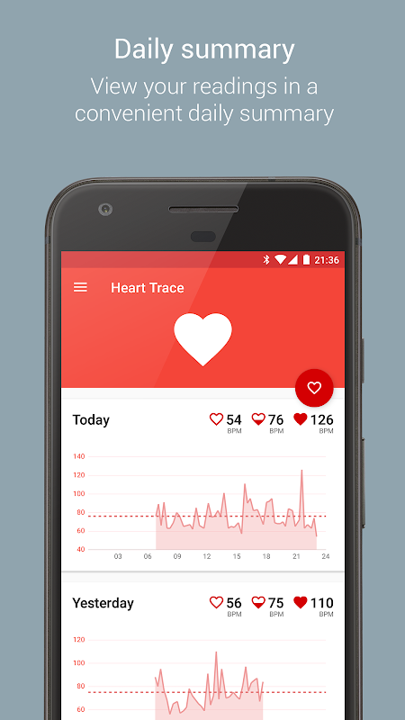 Heart Trace vérifie automatiquement votre fréquence cardiaque à intervalles réguliers via votre montre intelligente Android Wear et synchronise les données de fréquence cardiaque avec Google Fit. Vous pouvez afficher votre fréquence cardiaque par jour, heure ou minute ou sous forme de résumé quotidien.