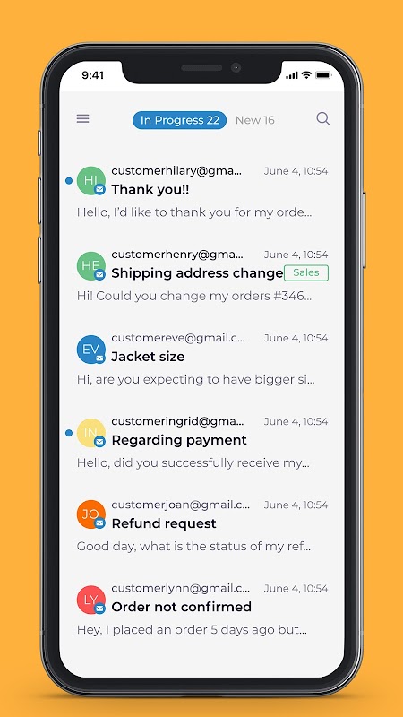 HelpCenter est une application de service client intuitive, facile à configurer et à utiliser pour les marchands Shopify. Avec cette application pour téléphones mobiles, nous permettons à tous les utilisateurs HelpCenter d'exécuter toutes les fonctions essentielles du service d'assistance sur leurs appareils mobiles. Vous pouvez désormais réagir rapidement aux demandes de vos clients où que vous soyez. Chaque fois que vous recevez un message du client, que ce soit un e-mail, FB Messenger ou un chat, vous recevez des notifications sur votre téléphone mobile. Vous pouvez lire, répondre ou attribuer à un autre agent le message que vous avez reçu ou effectuer d'autres fonctions essentielles du service d'assistance. Soyez efficace et gagnez des tonnes de temps précieux pour l'équipe d'assistance grâce à notre application mobile.