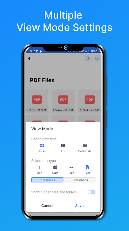 Trois types de modes d'affichage tels que Icône, Liste et Liste détaillée. Quatre types de tri tels que Titre, Date, Taille et Type. Également option pour afficher ou non les fichiers et dossiers cachés.