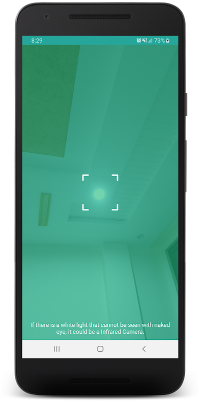 2. Détecteur infrarouge : en utilisant cette fonctionnalité, l'application Détecteur de caméras cachées peut détecter les caméras cachées, les vidéosurveillances basées sur les rayonnements infrarouges. Les rayonnements infrarouges ne peuvent pas être vus à l'œil nu, mais cette fonction montre une lumière blanche sur l'écran à la place de la caméra.