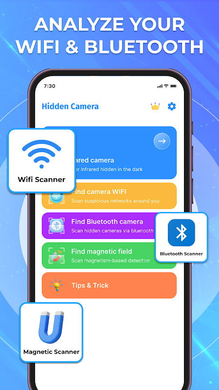 Imaginez la confiance de savoir que votre espace personnel est vraiment privé. Avec l'application Hidden camera detector free, protéger votre vie privée n'a jamais été aussi simple. Hidden camera finder conçu pour tout le monde, cet outil intuitif vous permet de Detect hidden camera et de sécuriser votre environnement en quelques clics.