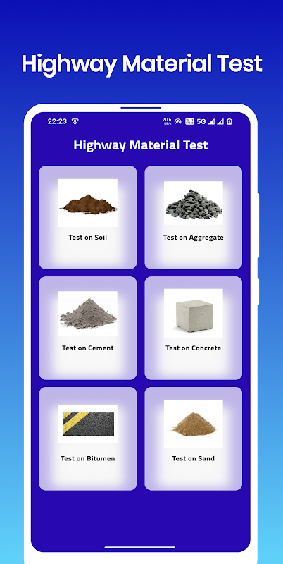 Cette application est très utile pour les ingénieurs routiers pour connaître les matériaux utilisés dans les autoroutes et les tests. Cette application comprend des tests de catégories appropriés tels que des tests sur le sol, des tests sur du ciment, des tests sur du bitume et bien d'autres.Lorsque vous ouvrez des sous-catégories, vous obtiendrez des tests liés aux matériaux respectés.
