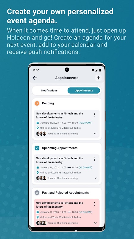 Quand vient le temps d'y assister, ouvrez simplement Holacon et partez ! Créez un agenda pour votre prochain événement, ajoutez-le à votre calendrier et recevez des notifications push