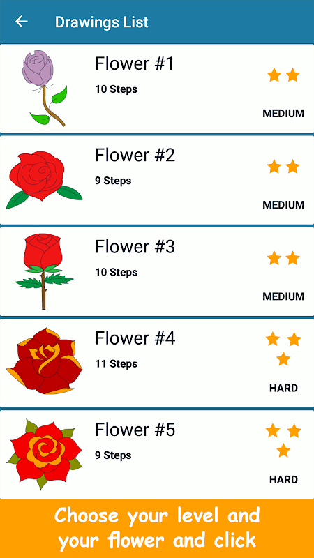 This app is specialized in how to draw a rose and also how to draw a flower like how to draw a pretty flower and how to draw a rose for kids so if you want to learn drawings of roses and if even you like to know simply how to draw something easy you can follow this step by step drawing guide, it's all cool and easy drawings of roses and flowers. you can select between three level of drawings difficulty.