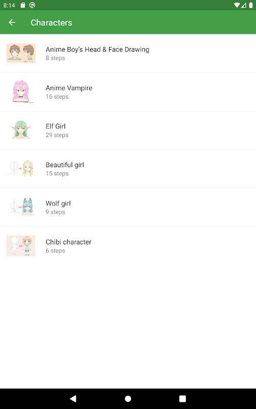 Apprenez à dessiner un anime étape par étape grâce à notre application qui vous donne des conseils et un tutoriel étape par étape pour dessiner une figure d'anime. L'application est conçue pour les utilisateurs débutants et avancés. Grâce aux guides détaillés avec une description de toutes les actions, vous réussirez certainement! Le matériel d'application cohérent contient des informations sur la façon de dessiner une tête, des yeux, des cheveux en étapes claires et faciles, des leçons sur le dessin, l'esquisse et la coloration de votre travail.
