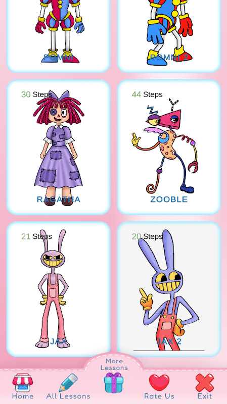 Que faire dans l'application ? Pour commencer, sélectionnez le personnage que vous souhaitez dessiner. Il peut s'agir de CAINE, GANGLE, Gloink Queen, JAX, Kaufmo, KINGER, POMNI, RAGATHA, ZOOBLE et autres. Après avoir choisi un héros, commencez la leçon ! Répétez toutes les étapes données dans la leçon et vous dessinerez facilement le personnage de dessin animé sélectionné. Croyez-moi, vous n'avez pas besoin d'expérience ni de compétences en dessin. Tout s'arrangera ! Suivez les cours de l'application Comment dessiner d'étonnants cirques numériques étape par étape et le résultat ne se fera pas attendre !