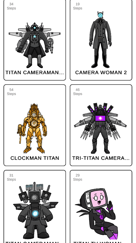Que faire dans l'application ? Pour commencer, sélectionnez le personnage que vous souhaitez dessiner. Avant cela, n'oubliez pas de prendre une feuille de papier, un crayon et du linge. Après avoir choisi un héros, commencez la leçon ! Répétez toutes les étapes indiquées dans la leçon et vous dessinerez facilement le personnage de dessin animé de toilettes skibidi sélectionné. Croyez-moi, vous n'avez pas besoin d'expérience ni de compétences en dessin. Tout va s'arranger ! Suivez les leçons de l'application Comment dessiner des toilettes skibidi pas à pas et le résultat ne tardera pas à venir !