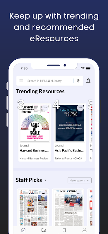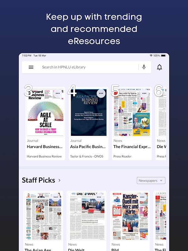 L'application HPNLU eLibrary offre à ses utilisateurs un accès mobile et en déplacement à une vaste collection de ressources électroniques et de flux d'informations, notamment :
